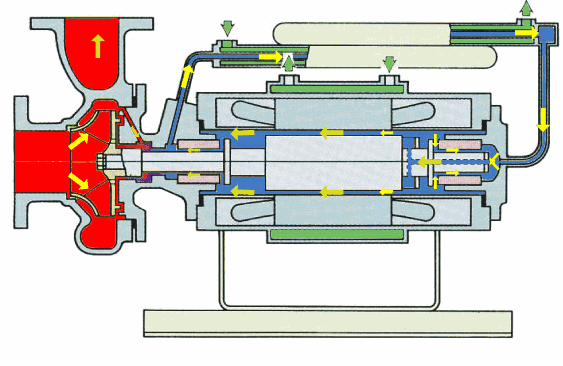 H型高溫型屏蔽泵的輸送介質(zhì)溫度可高達450℃。通常在屏蔽電機外增加冷卻水套和在外部循環(huán)管加冷卻套管,將高溫循環(huán)液冷卻以降低電機和軸承溫度。在功率不大的場合,有的制造廠不采用冷卻液,而是在電動機外部設(shè)置散熱翅片和用特殊繞組來適應(yīng)工況,其使用溫度一般不能超過400℃。